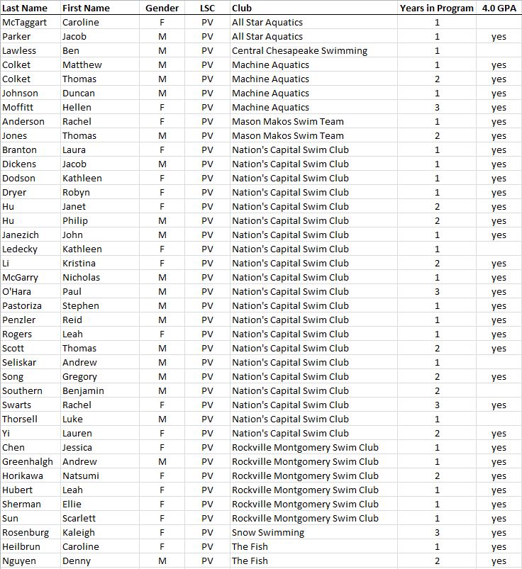 The following PVS Athletes were named by USA Swimming to the 2012-2013 Scholastic All American Team.