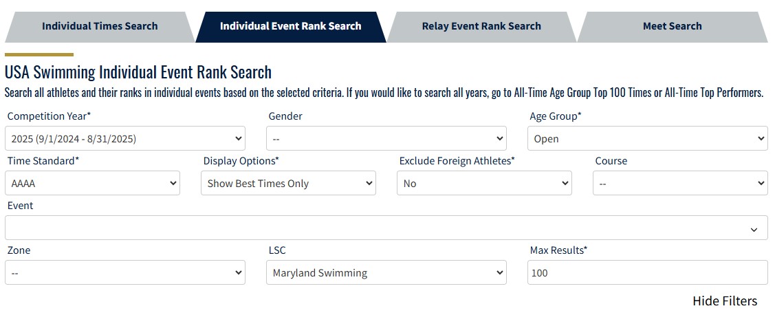 Instead of the periodic snapshots of the PVS top times lists as produced in past years, the USA Swimming SWIMS database now provides the ability to display up-to-date top times lists (once the meet is loaded into the database). Here are some brief instructions on how to use this capability.